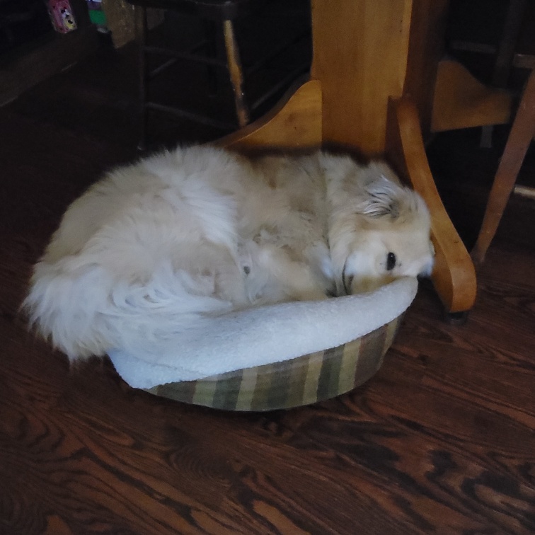 And then seriously -- why does Murphy do this? This bed is way too small for her, but she loves it. Her butt hangs over the edge, but she is quite content, so who am I to throw it out?