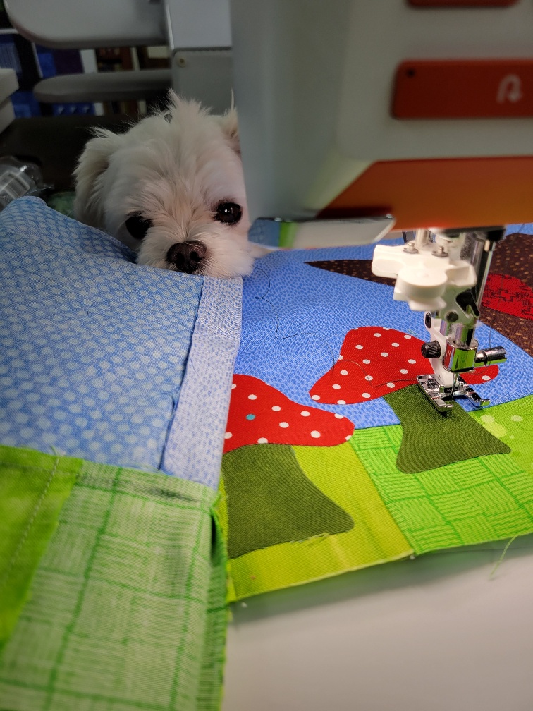 I had one goal in mind for the day, and I managed to accomplish that. The goal was to finish the LAST TWO rows of this All in a Row quilt. I'm happy to say that the row of stars (just above the owls) is DONE! All the seams of those star blocks are twirled, and they fit together very nicely.
