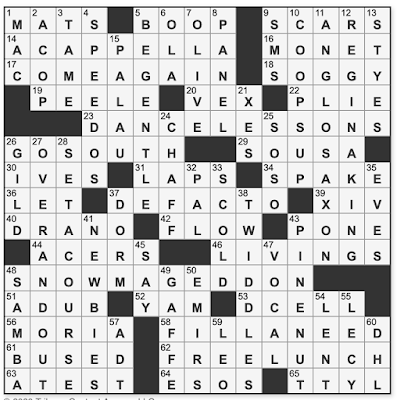 By the way, this is my 10th LA Times puzzle, all of which have been Saturday themelesses--including my very firstnewspaper crossword back in 2009. My thanks to Rich Norris, Patti Varol, and the editorial team who have given me the chance to share my puzzles in this venue; to the bloggers at Crossword Corner and elsewhere, thanks for sharing your thoughts on my puzzles; and to the solvers reading this, I hope you enjoy it!