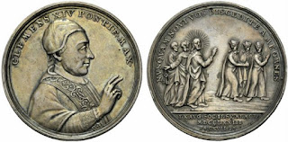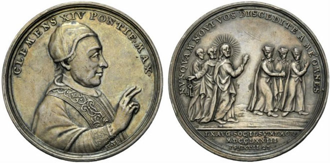 39. The last pope named Clement: XIV (1760 - 1774) Obverse: Clement XIV. Reverse: Jesus, Peter and Paul expelling the Jesuits which Clement did in their name