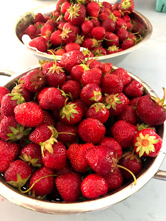 Four girls went picking with me, we came home with five quarts of the most delectable berries ever. They were so delicious, I decided it was worth breaking my fast yesterday, strawberries...warm from the sun, sweet, heavenly. We picked them at a local Mennonite farm. The girl working in the little store had to been all of twelve years old, barefoot with braids and a pretty dress on. She had such a sunny disposition, and she figured out that math like a pro, counted out the change, and wished us a very nice afternoon.
