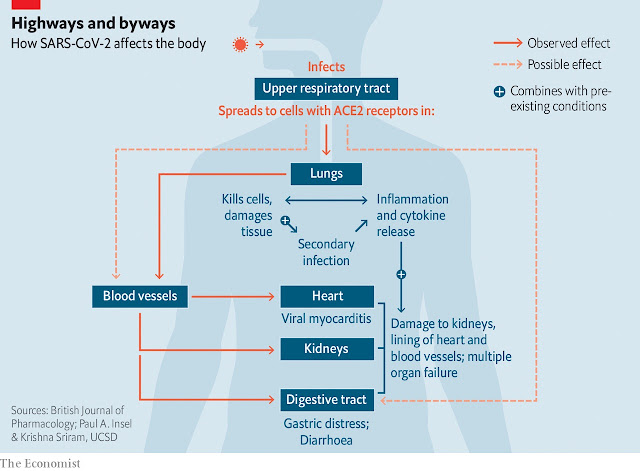 In a healthy person with few co-morbidity indicators, the virus may get no further than the ACE2-coatings in the nose and throat, and perhaps the lungs, before the body’s defenses eliminate it. Tests that look for genetic material from SARS-CoV-2 in swabs from the nose and throat frequently find it present in people who are asymptomatic. Up to 70% of those testing positive are asymptomatic.We know that ACE2 receptors are also in cells of kidneys, pancreas, gallbladder, intestines, testes, and in the nose’s olfactory cells. While Covid patients were 2.6 times more likely to have fever or chills, 2.2 times more likely to have trouble breathing or be coughing, and twice as likely to have muscle aches, they are 27 times more likely to have lost their sense of smell. That’s all about ACE2 receptors.