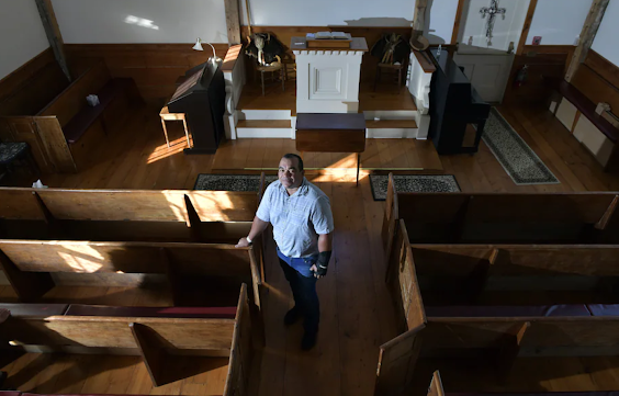 Darius Coombs, a Mashpee Wampanoag who serves as the tribe's cultural and outreach coordinator, stands in the old Indian Meeting House, built in 1684. It is one of the oldest American Indian churches in the eastern U.S. (Josh Reynolds for The Washington Post)