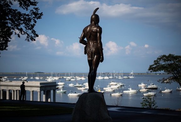 On a hilltop above stood a quiet tribute to the American Indians who helped the starving Pilgrims survive. Few people bother to visit the statue of Ousamequin — the chief, or sachem, of the Wampanoag Nation whose people once numbered somewhere between 30,000 to 100,000 and whose land once stretched from Southeastern Massachusetts to parts of Rhode Island.