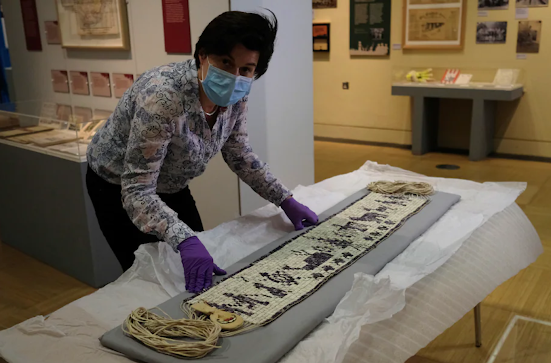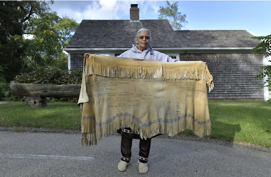 Anita Peters, a Mashpee Wampanoag who goes by her traditional name Mother Bear, holds a deerskin shawl that traces her ancestors back to 1580. (Josh Reynolds for The Washington Post)