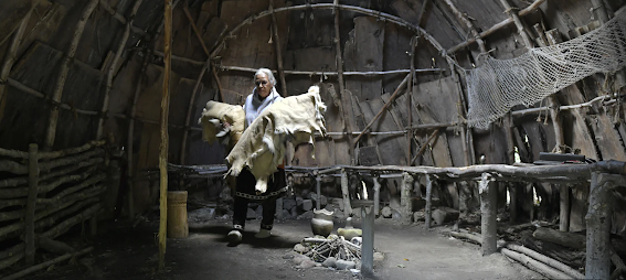 Anita Peters, who is Mashpee Wampanoag and goes by the name Mother Bear, packs up the traditional clothing and furnishings from the wetu, a traditional bark-covered wood-framed building that is part of the Mashpee Wampanoag Indian Museum 30 miles from Plymouth, Mass. (Josh Reynolds for The Washington Post)