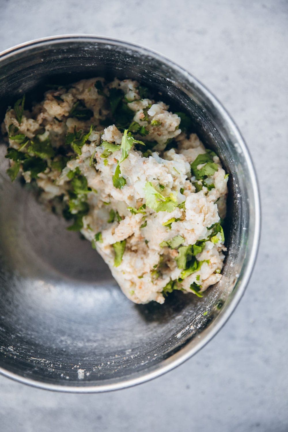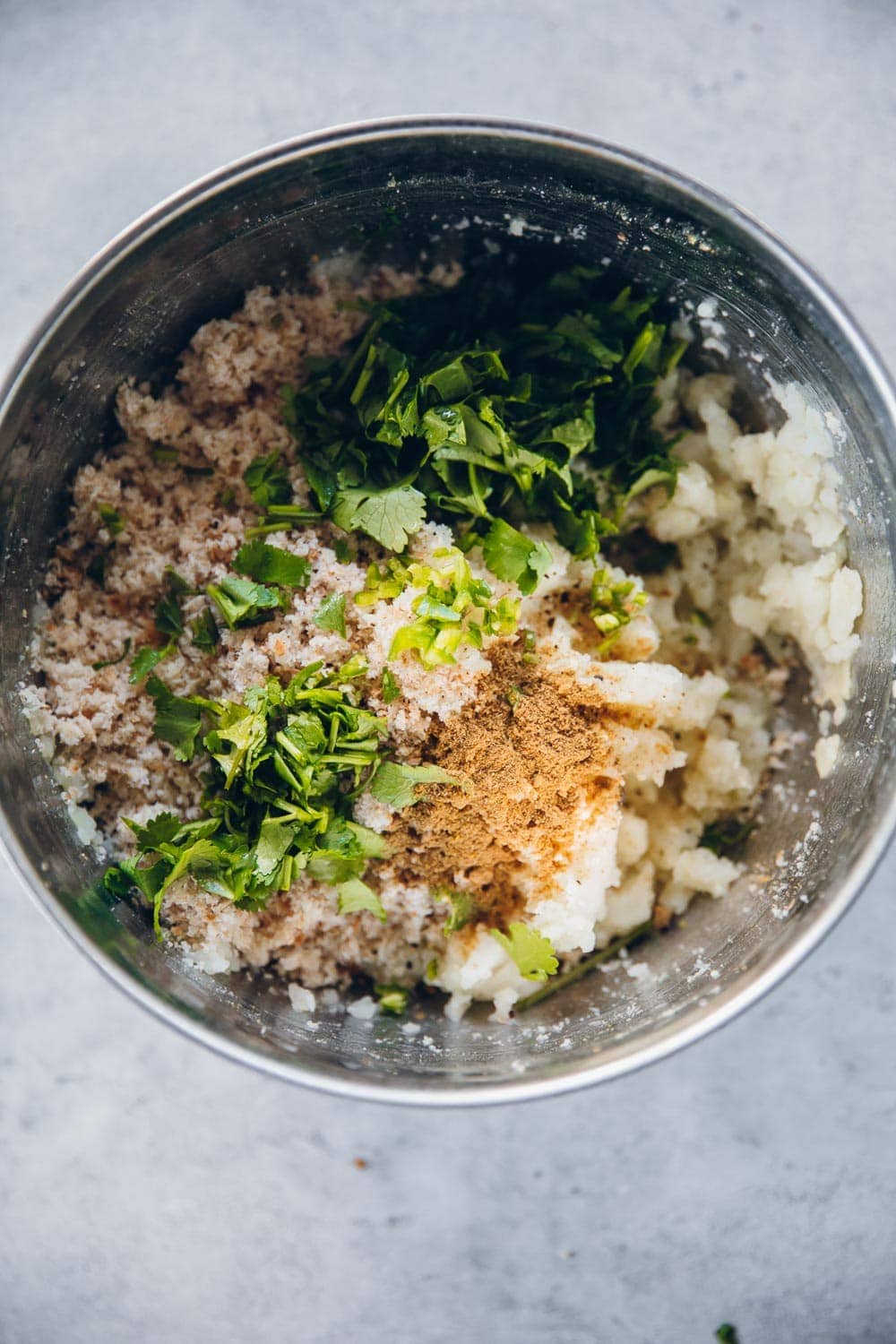 - Add fresh breadcrumbs, cornflour, cumin, chat masala, red chilli powder (if using), ginger, green chilli, coriander and salt. Using your hand, mash and mix well until thoroughly combined and a soft dough is formed.