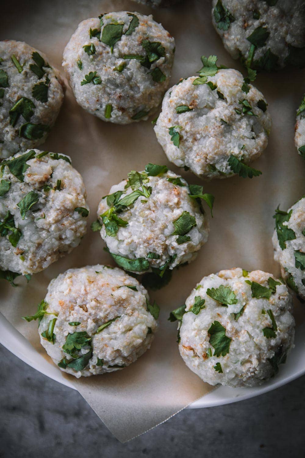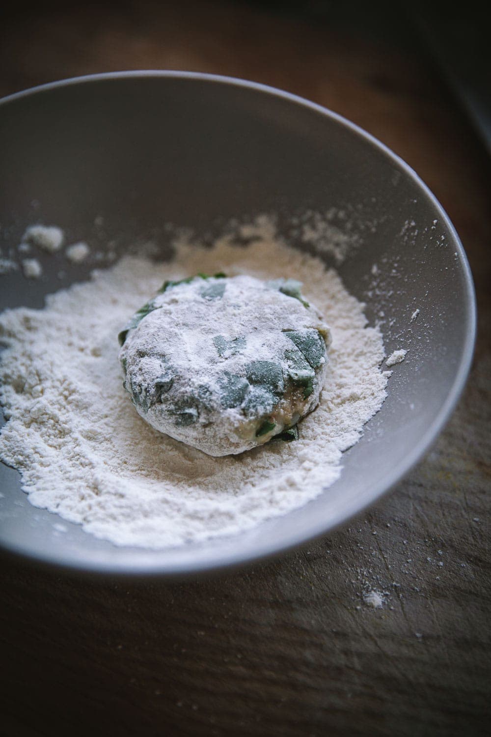 - With clean hands, take about half a cup of mixture in your palm. Shape into a round ball and then flatten to form a half-inch thick disc or patty. Place on a plate lined with baking paper. Repeat with the remaining mixture.