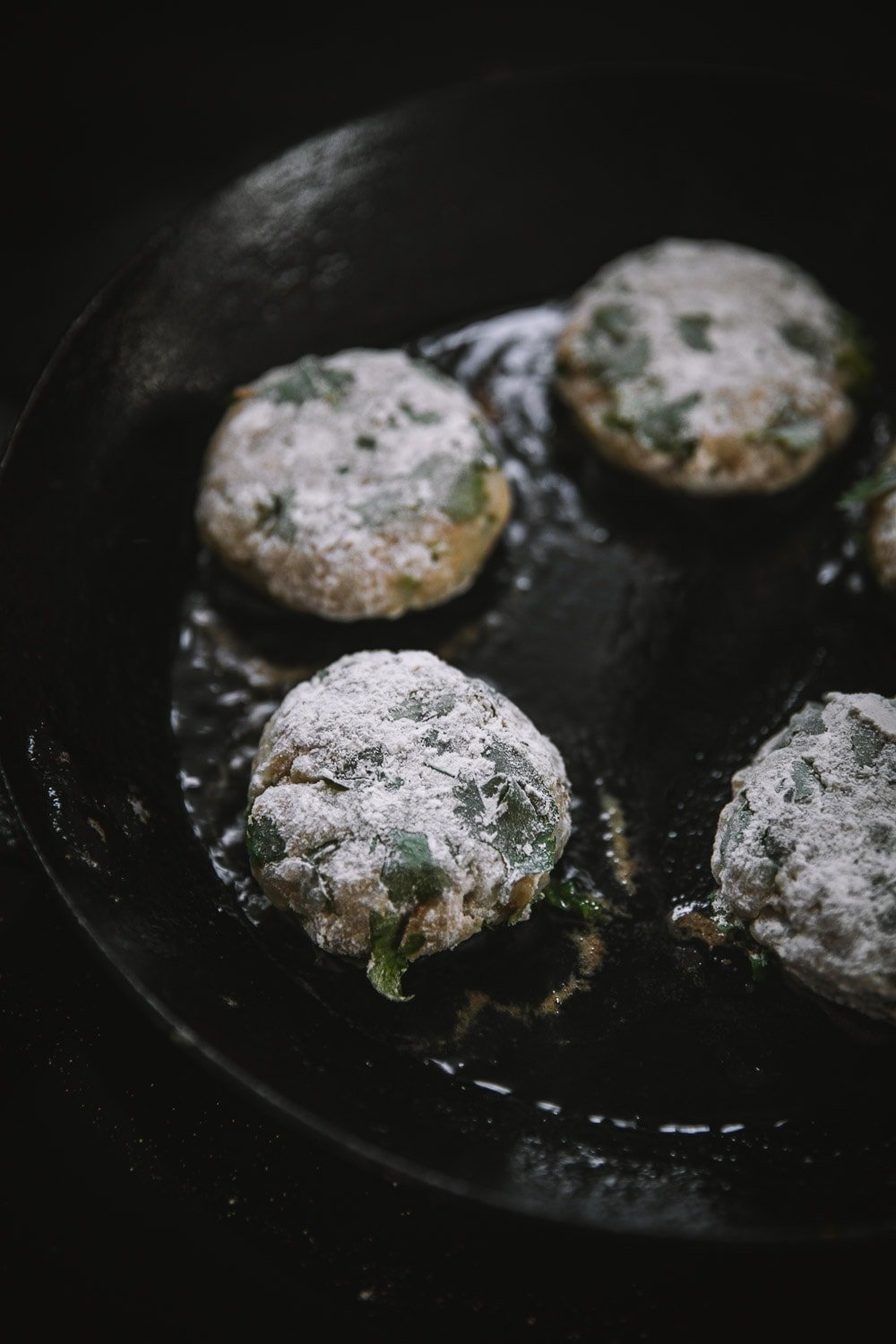 - Dust each potato patty on either side with the plain flour and place in the hot pan. Cook on medium-low heat for approximately 6-7 minutes on each side. If it starts to brown too quickly, reduce the heat and continue cooking. Repeat with all the aloo tikkis.