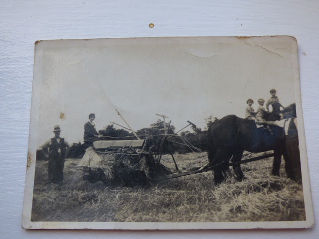 The photo is of my Gran (who I never knew as she died when I was one) on the binder, my grandad standing on the right by the horse and up on the horse are my Auntie Winnie, her twin brother - my real Dad Edwin and my Uncle (who became my Dad after my real dad was killed in a motorbike accident just before I was born). The man on the left is named on the back of the photo as Bill Green who must have been helping with the harvest on the farm at Ringshall, a village not far from Stowmarket.