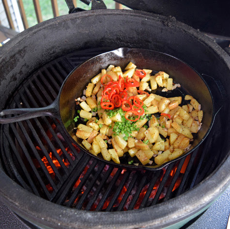 - Potato hash featuring Yukon gold potatoes, diced onion, sliced mini-sweet bell peppers, diced jalapeno, Kinder's Master Salt, and black pepper.
