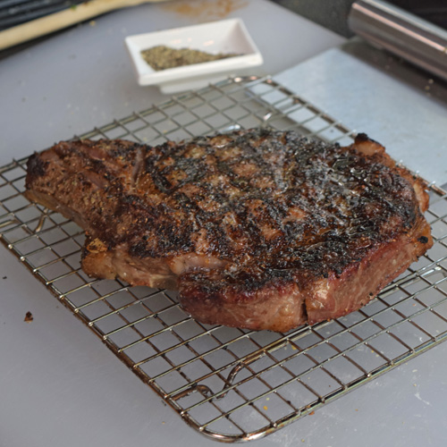 | As always, I rest our steaks on a cooling rack - a trick I learned from Rouxbe.com. Putting hot meat on a flat surface traps heat and steams the fibers, causing more loss of juices. This prevents that. I tried it side by side once and was convinced. |
