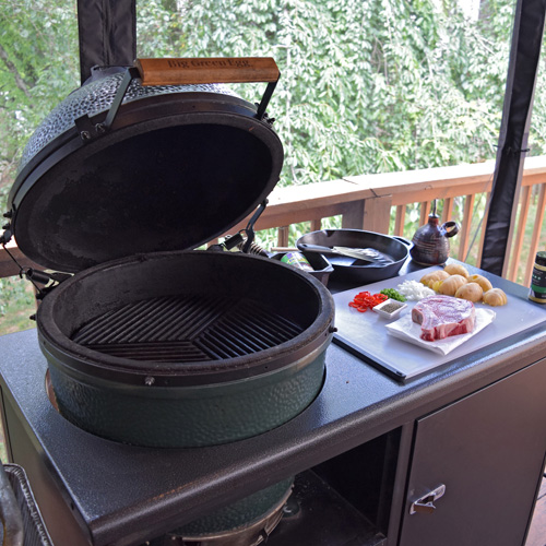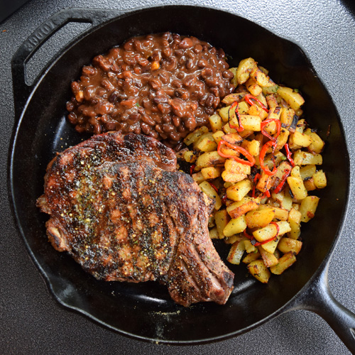 This weekend, we bought a 20-ounce, black Angus, cowboy ribeye steak from Butler and Bailey Market. We grilled it on the Big Green Egg and served it with some crispy skillet potatoes and black beans for a delicious meal.