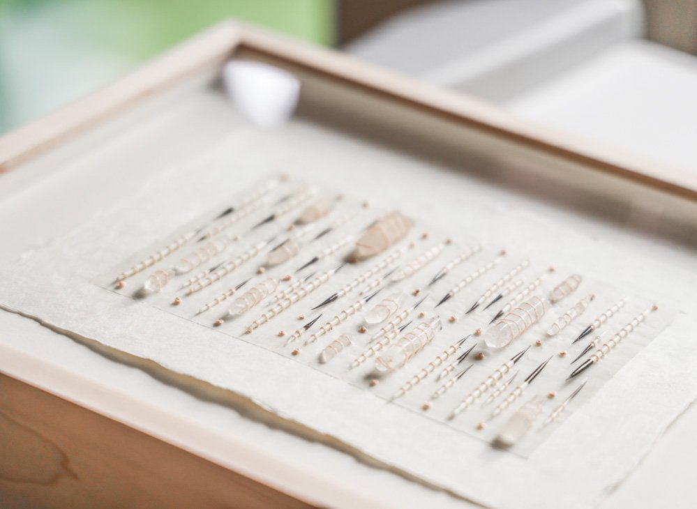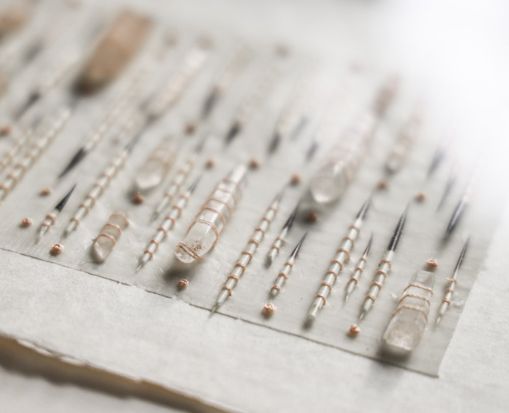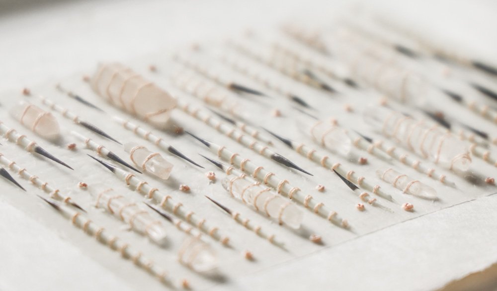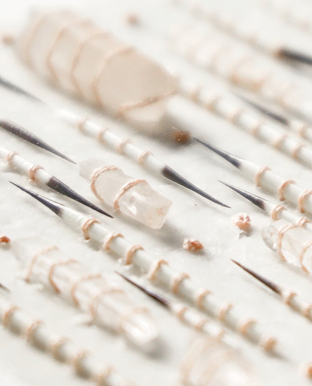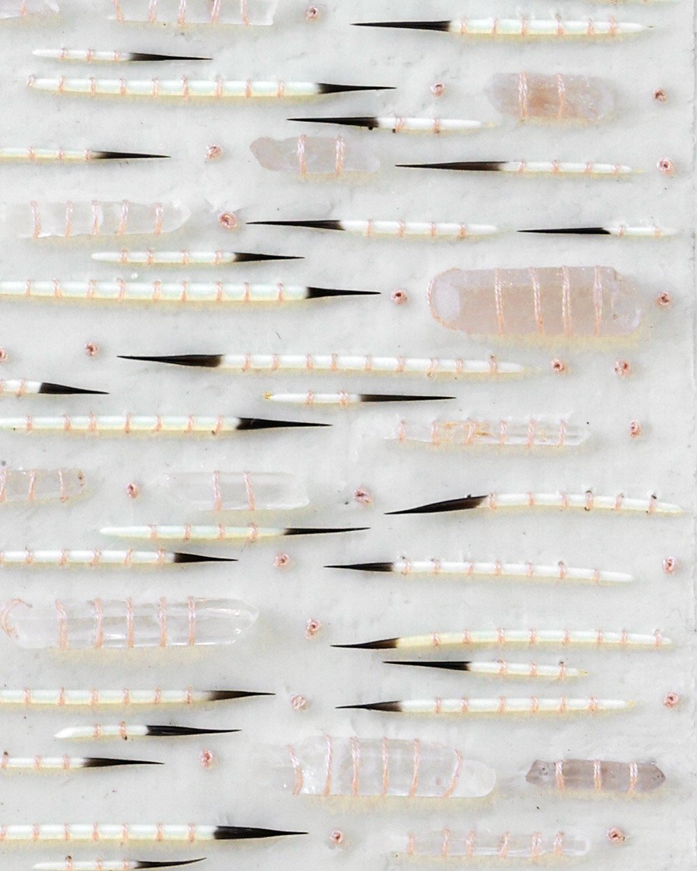 My primary inspiration is the natural environment, and at this point almost all of the materials I use are organic. However, this was not always the case. For many years I would simply incorporate little bits of natural ephemera into whatever I was making. Over time, I have learned to let the materials not just appear in my work, but to actually dictate every aspect of the process, leaving as delicate an “artificial” touch as possible. Increasingly, I find myself doing so little to the natural objects I have my hands on, such as leaves or crystals or porcupine quills, that I am starting to consider myself more of a facilitator, or celebrator of nature, than as an “artist.”