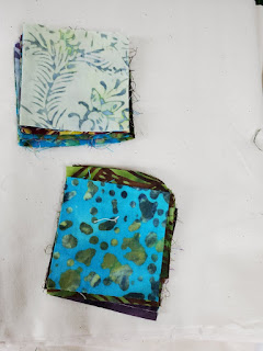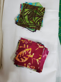 OH -- I'm going to start off the day with a question. In my tidying up, I came across this project. A TON of batik 2 ½" squares cut. They need a background. I found a HUGE hunk of this blue batik in the bag. It's not cut up but is supposed to be the background.
