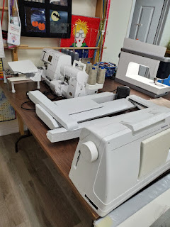 It's a long time since my sewing machines and sergers were this organized. All the not currently used stuff is stored on one table. There's one more serger and one more embroidery arm missing from the table, but there's also no more room!! Those machines take up loads of space. I'm just glad they are all together.