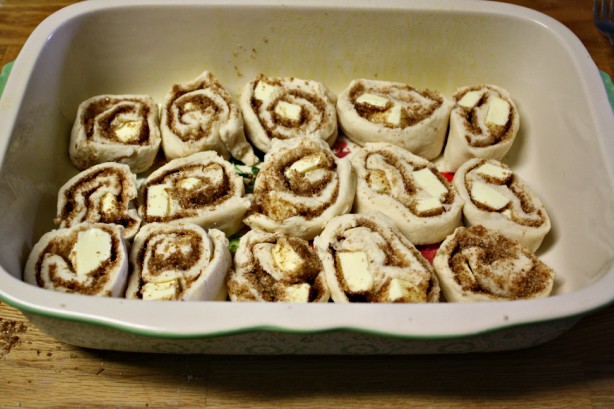 Roll the dough up cinnamon roll style. Cut the roll into 1 inch pieces and place into greased baking pan.
