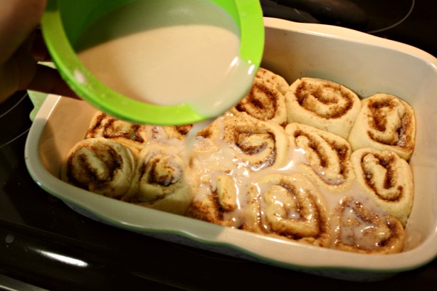 Remove from heat and pour the milk sauce over the rolls and bake an additional 15 minutes until the sauce begins to thicken and bubble and the rolls are golden brown.
