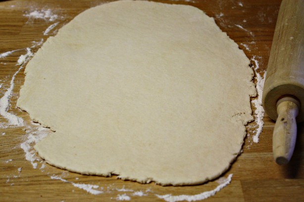 Sprinkle your work space with flour . Roll out the dough into a large rectangle (about 9 x 12 inch).