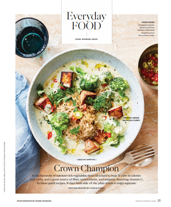 The Everyday Food section is an ode to broccoli, that gorgeous green cruciferous vegetable that most children find appalling. The article made me realize how infrequently I buy broccoli at the grocery store and the recipes included (broccoli curry, broccoli frittata) gave me more incentive to do so. There are also recipes for granola and four variations of patties to try on burger night, including vegetarian options.