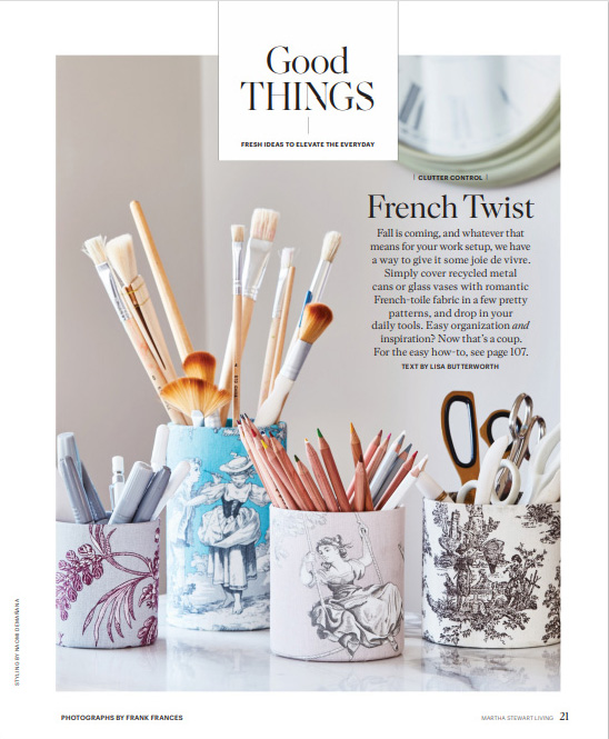 The Good Things column has a nice assortment of ideas to adopt this fall. From the home office to the kitchen, it's filled with fun ways to update old standbys, such as these toile-wrapped desk cups to hold pencils and other supplies. There are also instructions on how to refinish old wooden chairs and icing piping techniques.