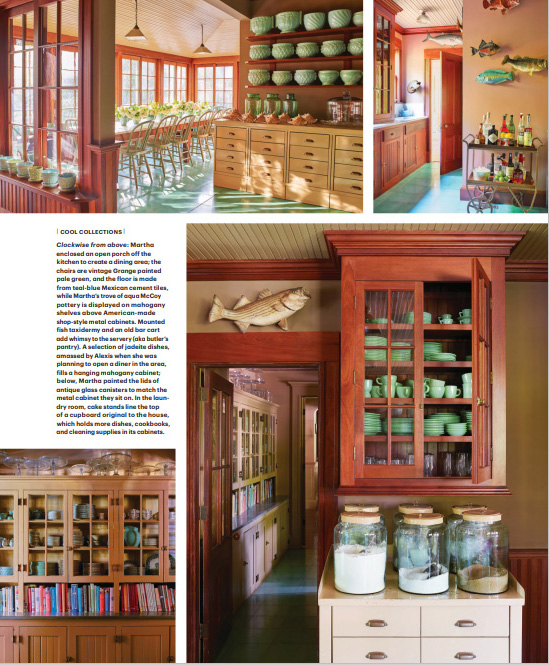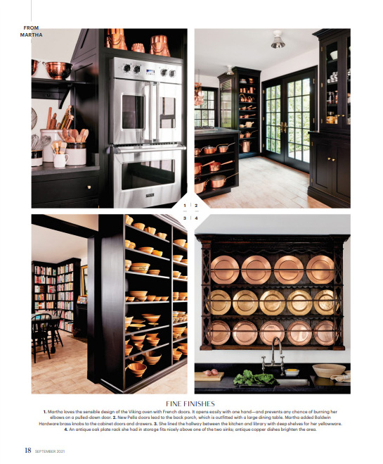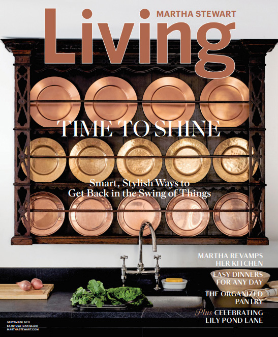 The cover image is an allusion to Martha's column in the issue, in which she details the renovation of her studio kitchen in the Maple Avenue house on her property in Bedford, New York. It was not a complete gutting of the space, but rather a simple refresh that involved new paint colours, new doors, shelves and appliances. The look is classic but modern with graphic elements that give the space definition. Martha moved her copper collection here from her main kitchen in the Winter House and it looks beautiful silhouetted against the new black shelving.
