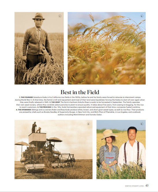 I really enjoyed reading the American Made column about Koda Farms in California, a rice farm founded by Keisaburo Koda in the 1930s. He and his family were forced to relocate during the internment of Japanese Americans during the Second World War but were determined to start again after they were released in 1945. The family now operates their own seed nursery where they carefully select panicles to plant to ensure quality.