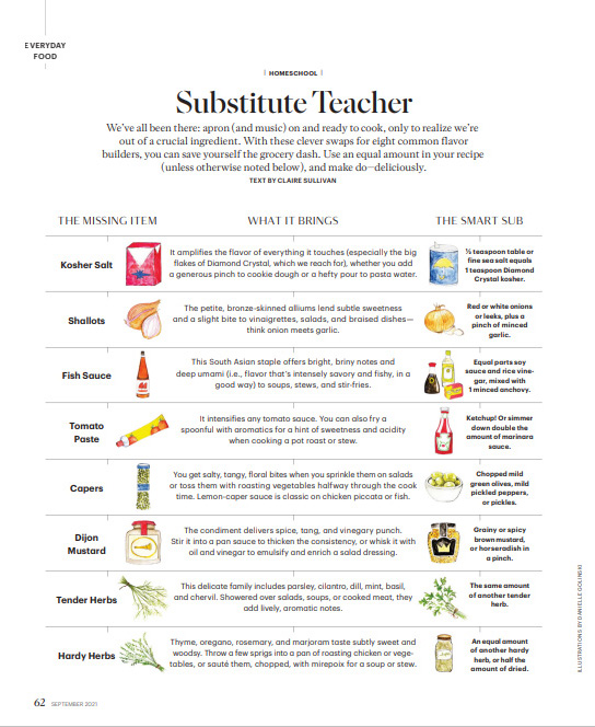 This substitution chart from the Everyday Food section has been printed out and now resides in my recipe binder. I find it so helpful! Capers are not a regular staple in my pantry, but green olives are: simply chop mild green olives, mild pickled peppers or dill pickles to get your substitute. Brilliant! I love simple solutions like this.