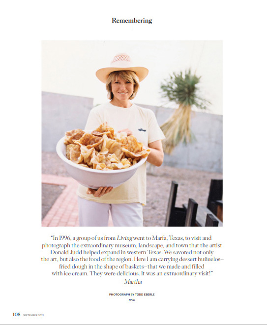 Martha's Remembering column is a fun reflection on a photoshoot she did in Marfa, Texas, in 1996 where she made a big batch of dessert bunuelos - fried dough in the shape of baskets, which she later filled with ice cream. How decadent!